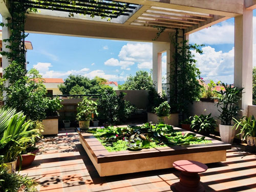 Tận dụng khoảng sân thượng chúng ta có thể thiết kế 1 khu vườn nhỏ: Nhiều cây, hoa và dây leo xanh mát, kết hợp với bộ bàn ghế nho nhỏ giúp chúng ta có thể hóng gió chiều, thư giản, hít thở không khí trong lành mỗi ngày.