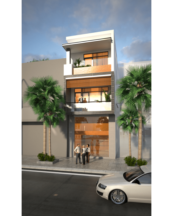 Thiết kế nhà phố với sự linh hoạt trong phối cảnh thiết kế, đã và đang đem đến nhiều lựa chọn cho chủ đầu tư. Hệ thống vật liệu mới như kính, thanh Profile nhôm cùng với hệ thống ban công xanh đã và đang mang đến một sức sống cũng như một làn gió mới cho không gian nhà phố. Hệ thống lam nhôm với thiết kế ngang dọc được bao phủ toàn bộ tầng thượng, kết hợp cùng kính để tạo hệ thống giếng trời. Khối ban công sắt và thiết kế bức tường chạy dọc với gạch thông gió màu cam, đủ để tạo hiệu ứng thẩm mỹ chung cho không gian sống của ngôi nhà.